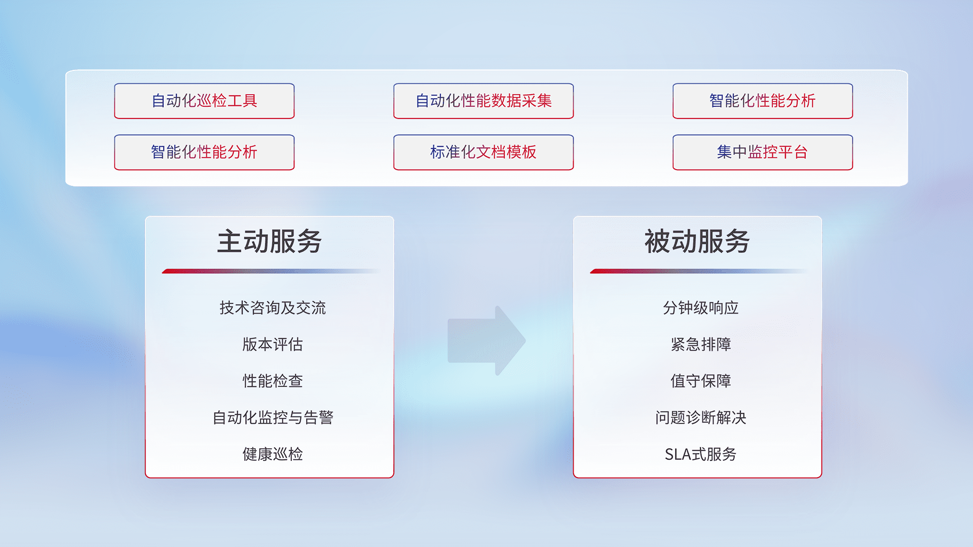 智能化工具和标准化文档,,,保障服务质量,,提供主动服务(包含技术咨询、、、版本评估、、、性能检查、、、自动化监控与告警、、健康巡检)和被动服务包含(分钟级响应、、、、紧急排障、、、值守保障、、问题诊断解决、、、、SLA服务)。。。。